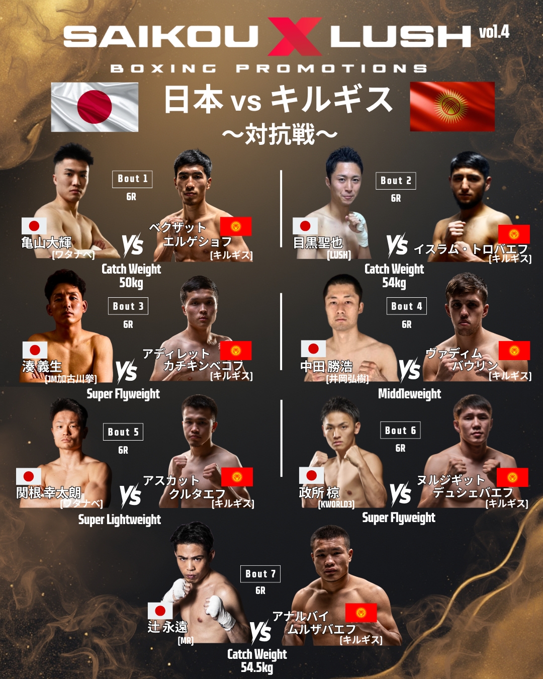 12月27日(土)に愛知国際展示場で開催する「SAIKOU×LUSH vol.4」のメインイベント、日本vsキルギス対抗戦7試合の見どころを更新しました。