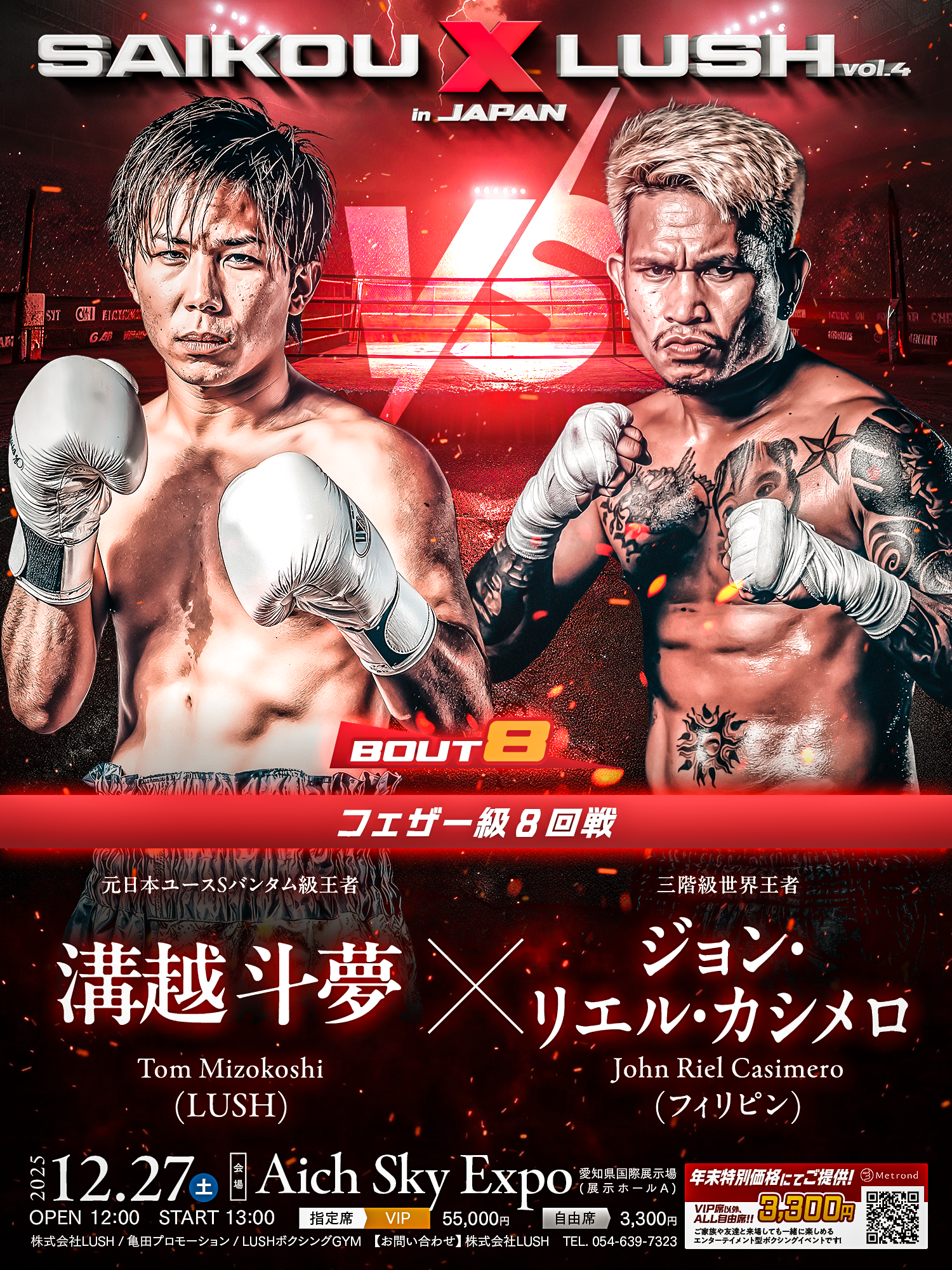 12月27日(土)に愛知県国際展示場で開催される「SAIKOU×LUSH vol.4」の追加カードとして、三階級制覇王者のジョン・リエル・カシメロ(フィリピン)が10月25日(キルギス)の亀田京之介戦での判定負けからの再起戦に日本のリングに登場することが発表された。