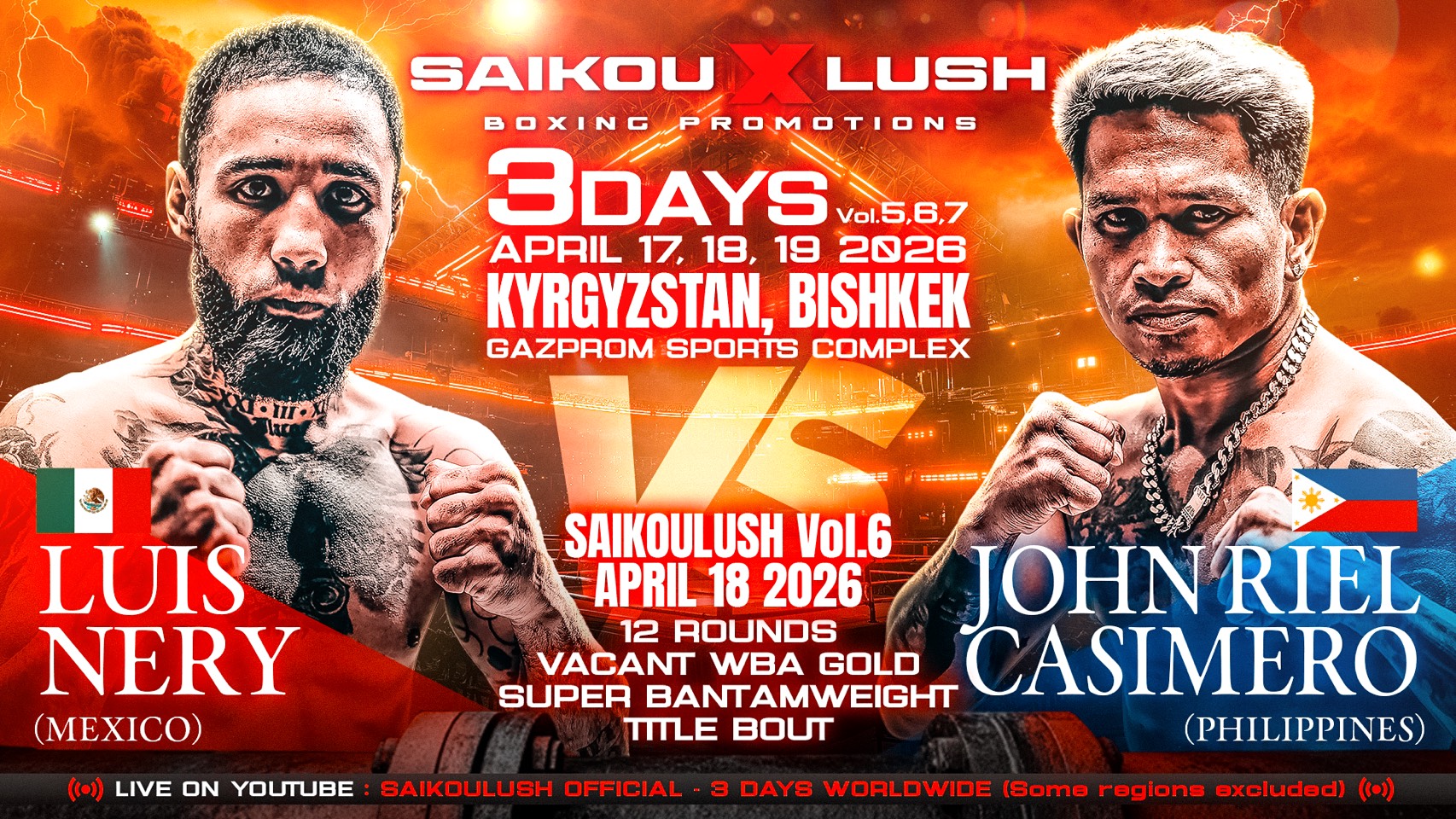 4月18日(土)の2日目に行われるWBAゴールド・スーパーバンタム級王座決定戦を含む、3日間開催の模様はYouTubeチャンネル「SAIKOULUSH OFFICIAL」にて全世界に向けて生中継される。(一部地域は除く)