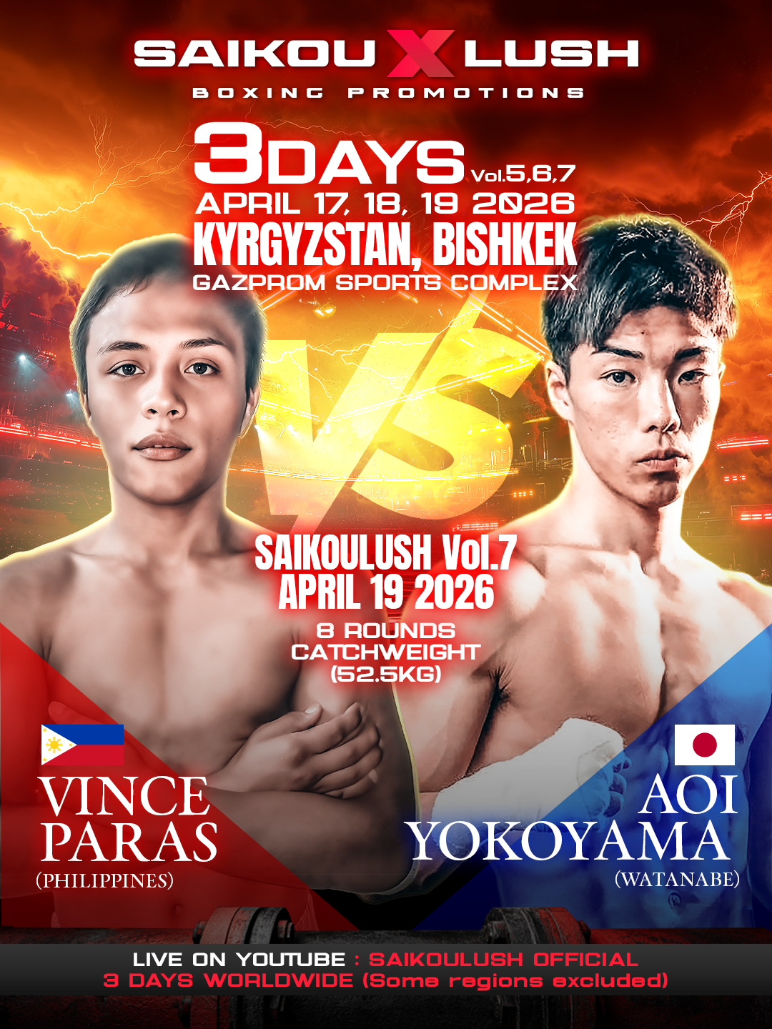 最終日となる4月19日(日)の「SAIKOULUSH Vol.7」では、ワタナベボクシングジム所属の新鋭、横山葵海(Aoi Yokoyama)が、フィリピンの強豪ビンス・パラス(Vince Paras)と52.5kg契約8回戦で激突する。