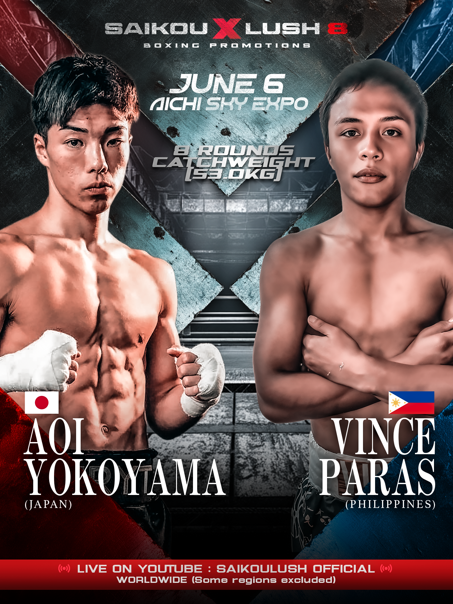 6月6日(土)に行われるIBF世界フライ級タイトルマッチを含む大会の模様は、YouTubeチャンネル「SAIKOULUSH OFFICIAL」にて全世界に向けて生中継される。(一部地域は除く)